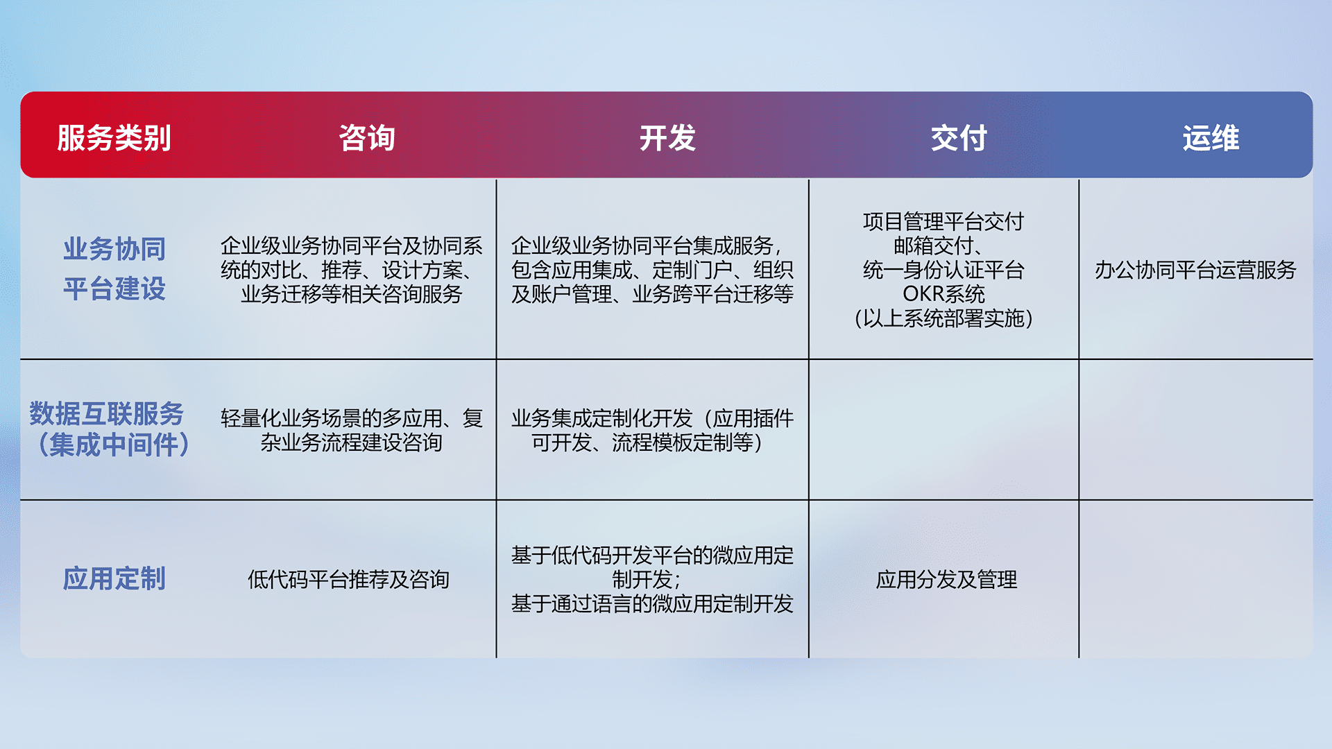 针对钉钉、、、企微、、、、IDaas等平台级产品提供产品的规划、、、方案、、、交付、、定制化开发等服务,,,,实现如统一协同办公、、、、智能客户服务、、混合会议管理、、、、智能数据查询、、等业务场景,,实现数字化转型。。