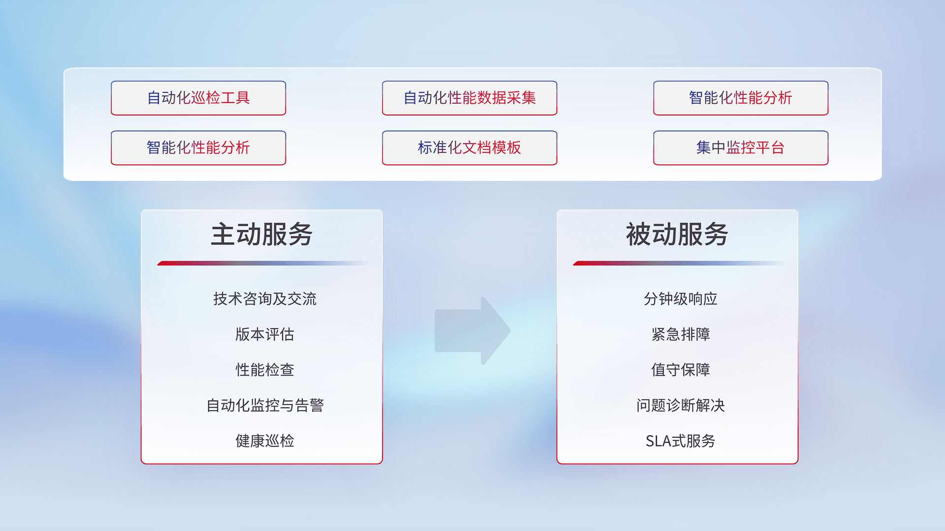智能化工具和标准化文档,,,,保障服务质量,,,提供主动服务(包含技术咨询、、、版本评估、、、、性能检查、、、自动化监控与告警、、健康巡检)和被动服务包含(分钟级响应、、紧急排障、、、、值守保障、、问题诊断解决、、SLA服务)。。。。